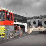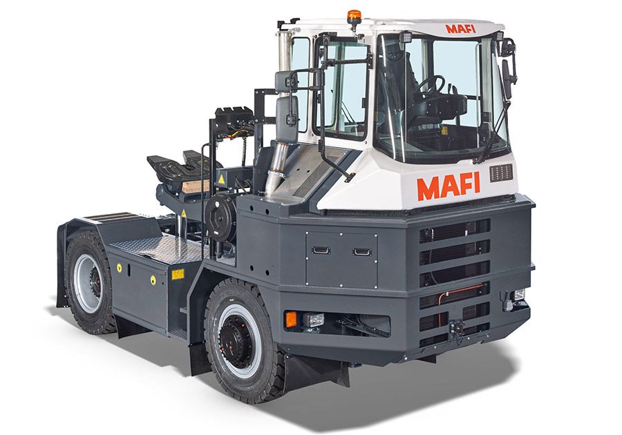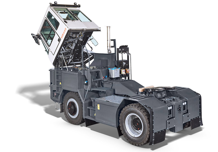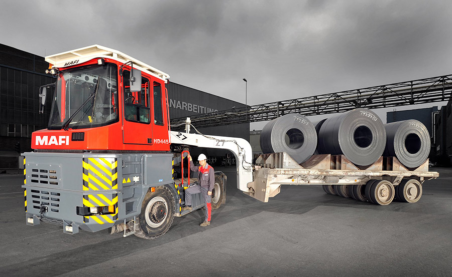 The HD 445 is MAFI’s largest and most powerful heavy truck and is designed for use in steel mills, foundries and other industrial applications requiring a very heavy-duty truck. The hydraulically operated fifth wheel plate can lift 45 tons and when used with ballast weights, the HD 445 can move over 200 tons! When used with drawbar trailers at maximum wheel load, the mighty HD 445 can pull even more. A variety of ballast weights can be added to augment traction with extra-heavy loads. In steelyards and terminal facilities, the HD 445 is much more versatile than a semi-truck and can haul many kinds of loads. Customers have a choice of efficient diesel powerplants with either Cummins or Volvo engines being available. The operator occupies a large, accessible cab with excellent all-around visibility allowing precise, quick control in tight confines.