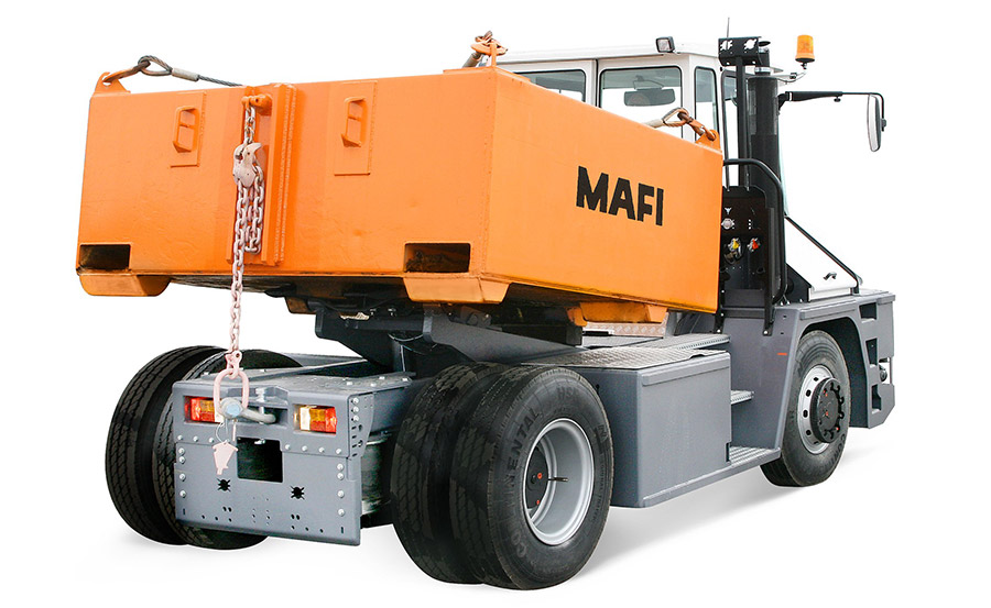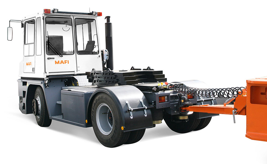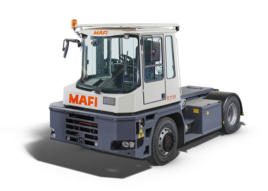 MAFI designed the R 332 Z RoRo truck to accept a variety of ballast weights to augment traction when shunting operations involve extra-heavy loads. The standard base plate is two tons and adjustable. Additional ballast weights can be attached as required. The 180° swivel seat and console are centrally located and turn with the steering and controls which automatically do a logical change in driving direction when reversed. The operator occupies a large, accessible cab with excellent all-round visibility allowing precise, quick control in the tight confines of RoRo vessels or within a RoRo terminal. Trailer hook-ups are conveniently located next to the trailer hitch behind the rear axle.